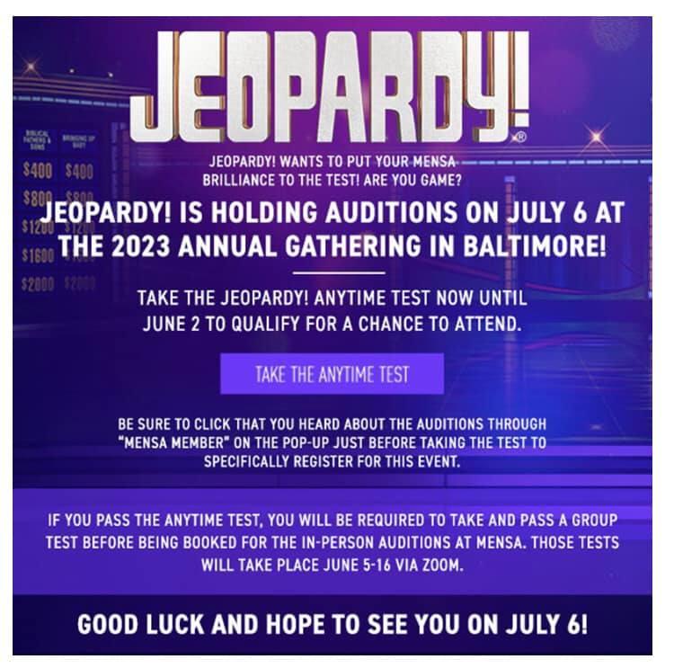 Try out for a chance for in-person auditions for Jeopardy! at the AG. Take the Anytime test until June 2.